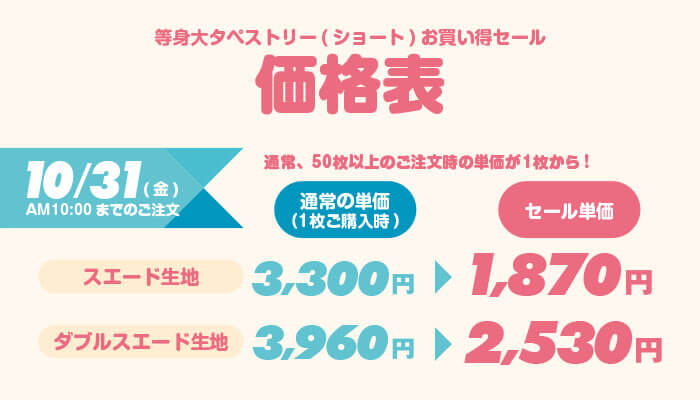 期間中、対象商品が1枚から最安値(通常時、50枚以上ご購入いただいた際の単価)でご購入いただけるとてもお得なセールとなっております(*^。^*)
